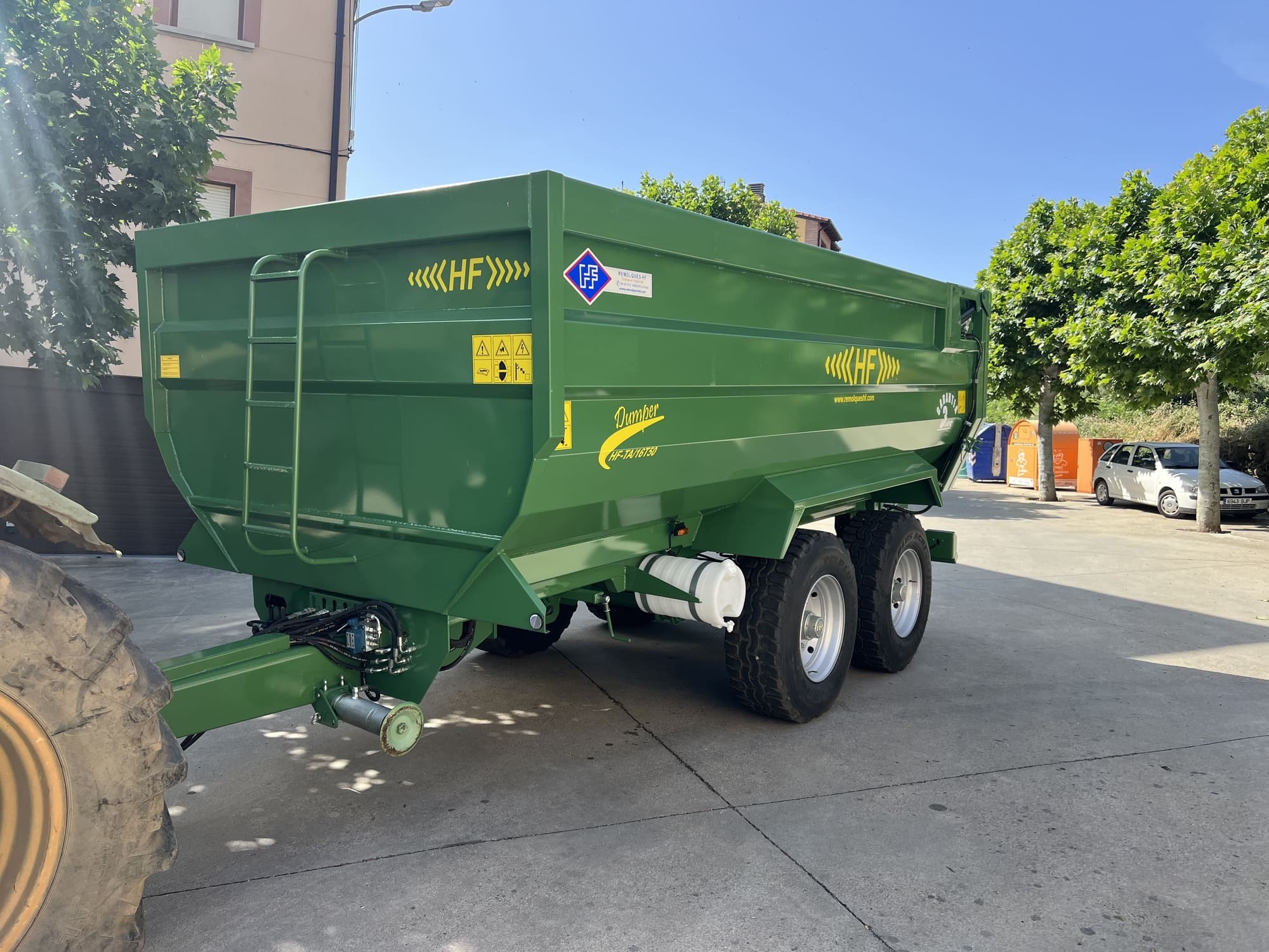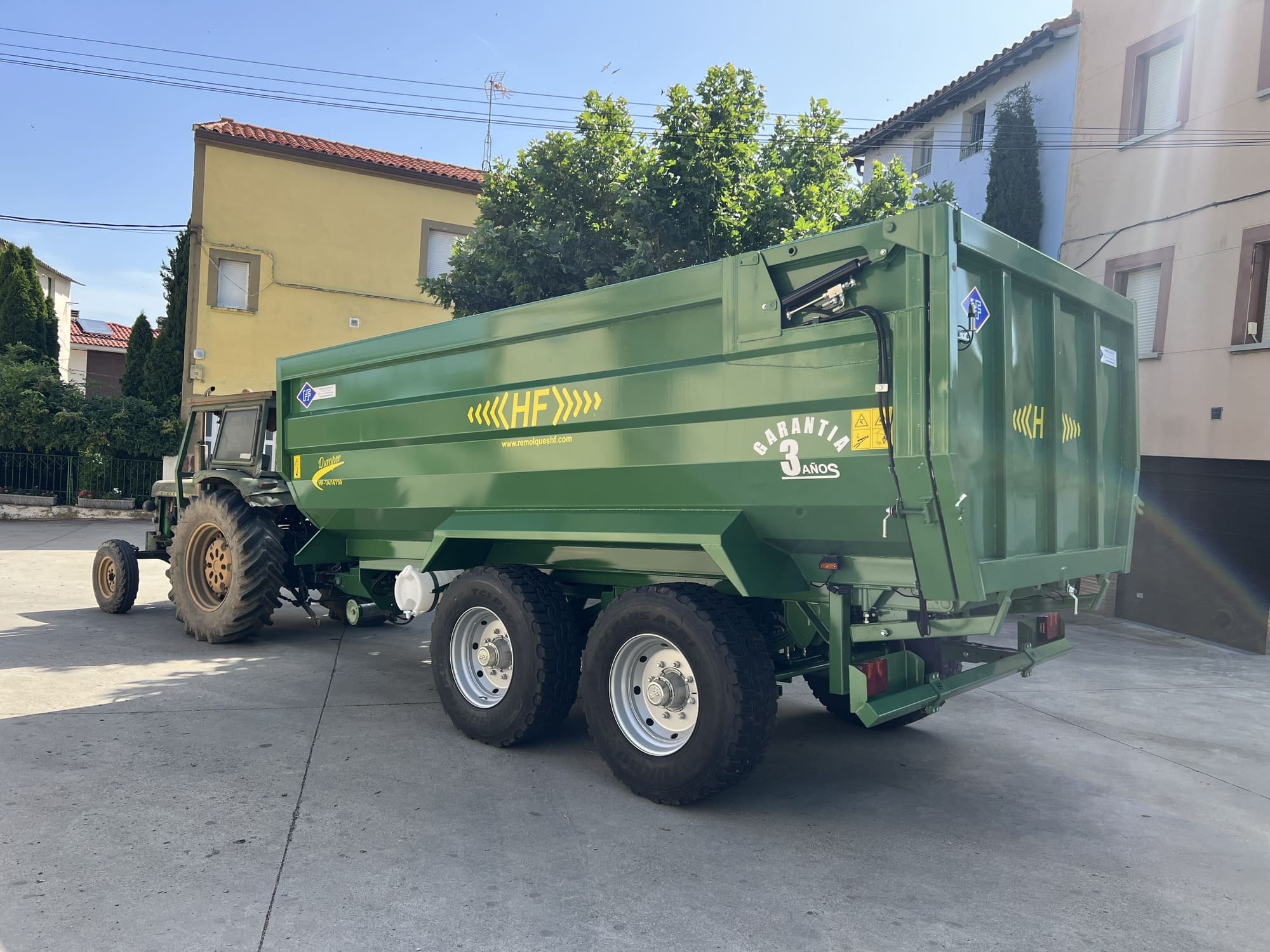 Descripción: Remolque basculante tipo bañera tándem con caja dumper. Lanza reforzada con suspensión por ballesta. Puerta hidráulica. Cajón de herramientas, deposito de agua, escalera, eje direccional, mozo hidráulico y rotativo trasero. Rueda 385/65R22.5”. 3 años de garantía.